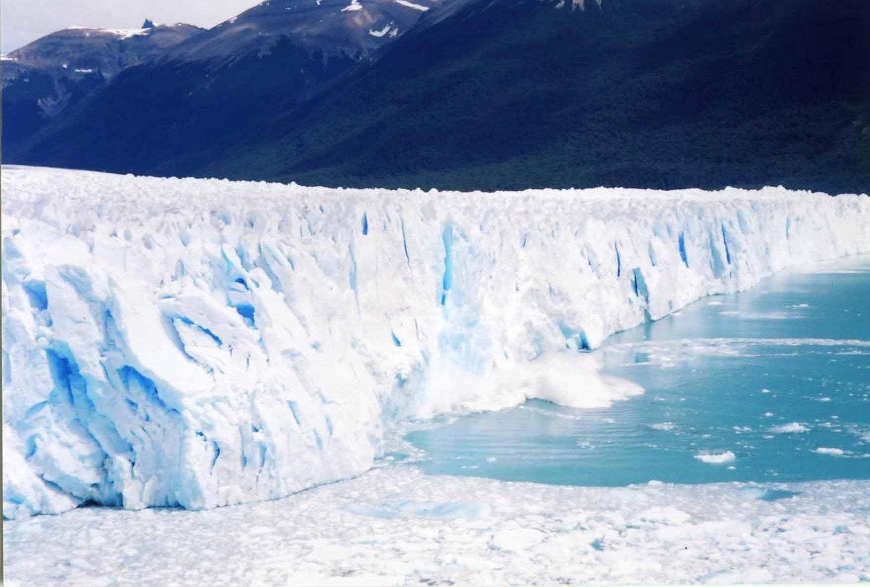*ペリトモレノ氷河、分かりづらいが氷河が崩落し水面に水飛沫があがった瞬間。