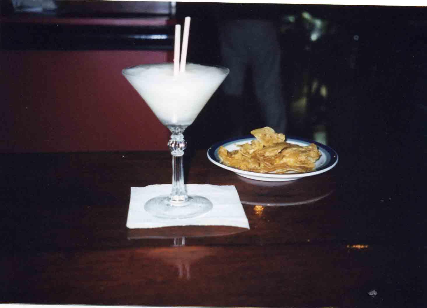 キューバの代表的なカクテル。物の本によれば、ラムを原料とし、レモン果汁、ソーダ水、砂糖、氷、そしてイエルバブエナという種類のミントを入れて、ミントをすりつぶしてステア(棒でかき混ぜること)して出来上がり、とのこと。ちょっと不思議な味ですが結構美味いデス。日本でもメニューに載っている店はあるようなので興味ある方は一度お試しあれ。