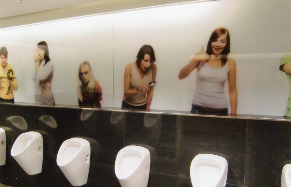 ※あるデパート内の男子トイレ。便器の前に様々なリアクションを取る女性の写真が。。