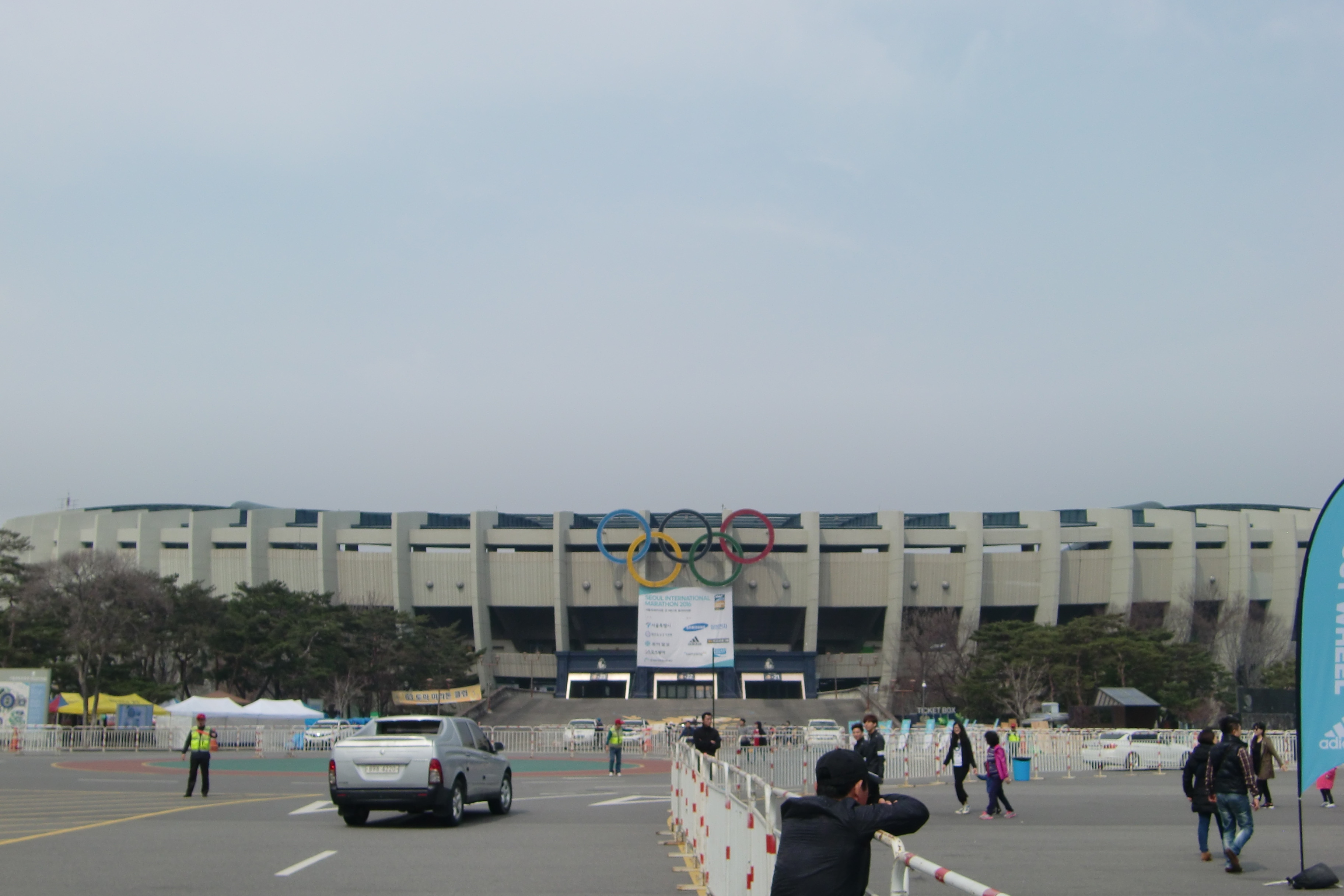 35kmを3時間36分で通過。ペースがガタ落ちし、30km過ぎからは前を向けず、下ばかり向いて走っている状態である。折角25〜30kmで頑張って作った貯金も吐き出し、4時間30分の目標タイムも厳しくなってきた。頭の中で残りの距離を7分30秒ペースだと最終タイムがどうなるか1km通過毎に計算するが、結構ギリギリである。所々立ち止まるも頑張って歩を進め、チャムシル大橋を渡る。すると右手にゴールであるオリンピックスタジアムが姿を見せた。この橋では毎年強風が吹くとのことであったが、今年は無風。平らなコースといい、風といい、気温といい本当に好条件に救われている感じである。
