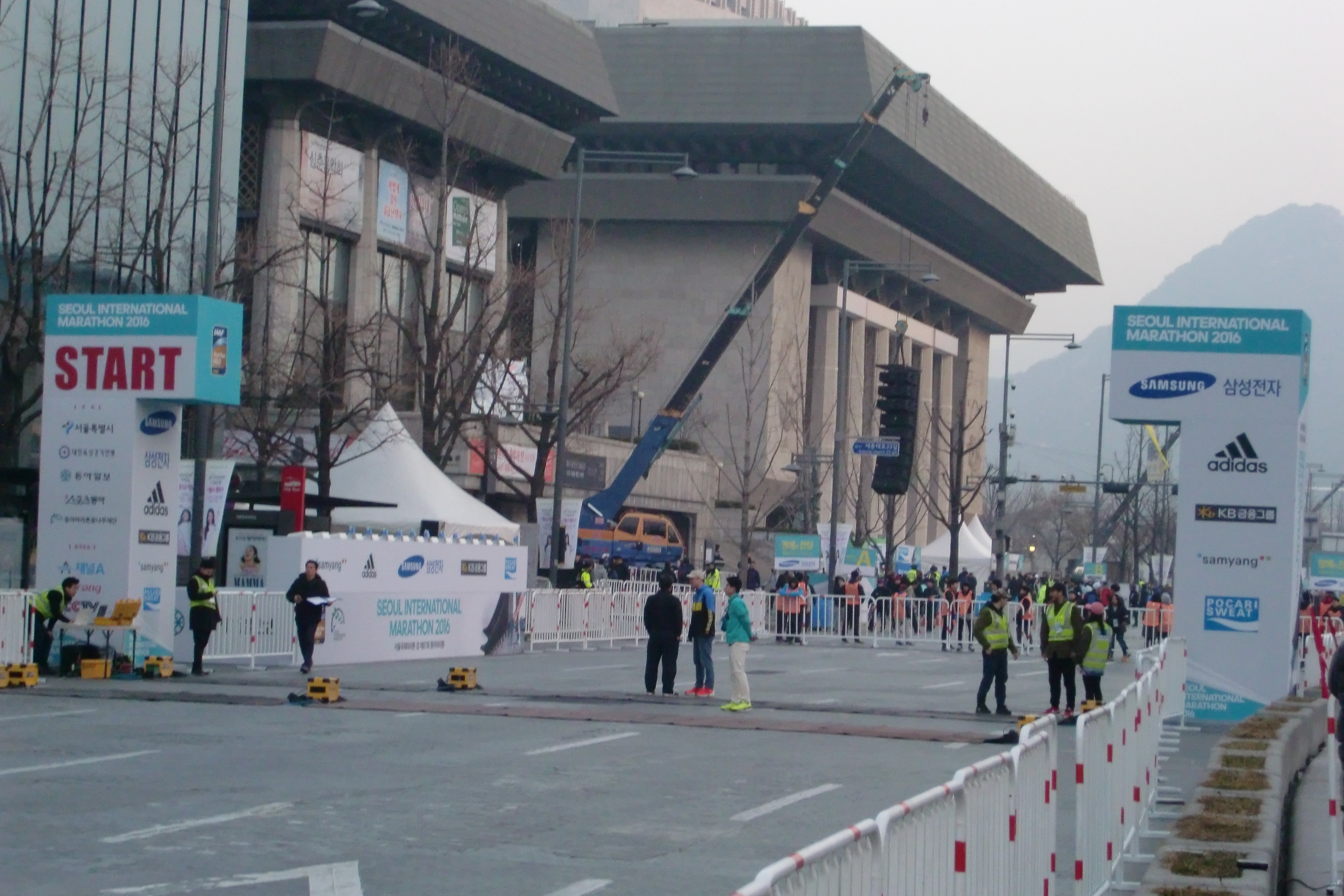 レース当日は、4:30起床。ソウルに発つ前夜があまり寝られず、ソウルに入ってからもいつもの癖で歩き回ったせいで疲労困憊。それが効を奏したのか19:30に就寝し、9時間も爆睡してしまった。睡眠は十二分である。6:10にホテルを出発し、6:40にスタート地点に到着。ソウル国際マラソンではスタート直前まで着ていた防寒着を恵まれない人に寄付するというシステムがあり、家族に評判の悪かったドイツ軍のジャンパーを着てスタート地点で待機。氷点下まではいっていないが、想像していたよりも寒かったので、体を冷やすことなく待つことが出来た。