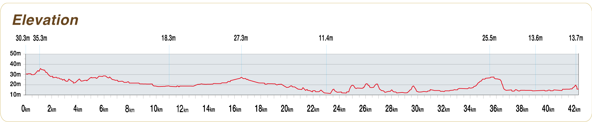 30km地点を何とか3時間ピッタリで通過。当初の目論見からは5分の貯金が出来たことになるが、ここで立ち止まって一息入れたのが悪かったのか、ここからガクっとペースが落ちた。1kmが7分、更には7分30秒に落ちていく。膝の外側・内側・裏側、脹ら脛、太股、脚の全てが痛く、エアサロンパスを至る所に掛けまくる。スプレーを振り掛けるサービスも所々で見かけたが、そんなものでは間に合わない感じで、エアサロンパスを持ってきたのは大正解だった。これがなければタイムはもっとボロボロだっただろうし、下手したらリタイアしていたかも知れない。
