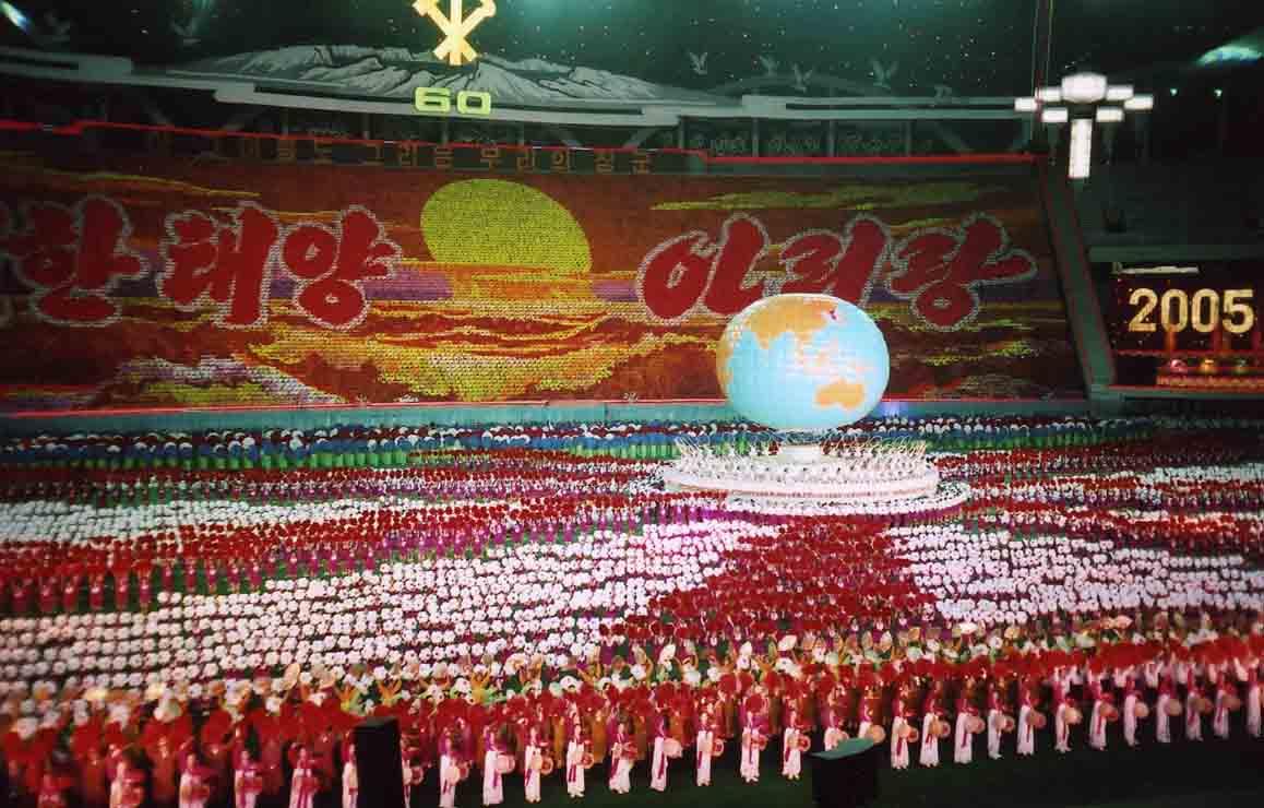 時間を忘れるほどアッという間にマスゲームは進み、終盤クライマックスとなったのが、フィールドの左右(つまり南北)に分かれて踊っていたダンサーがサッと中央に集まり、朝鮮半島を作り出したシーン。ご丁寧に済州島まで表現されていた。竹島があったかどうかまでは確認できなかったが、それはさて置き感動的なシーンであり、スタンドからも一層のどよめきと歓声があがっていた。最後は統一朝鮮半島を赤く塗り上げた、巨大な地球儀が現れ、感動のフィナーレとなった。