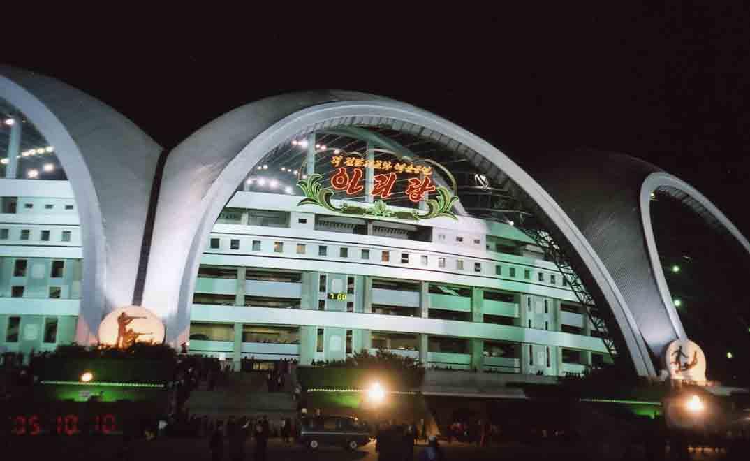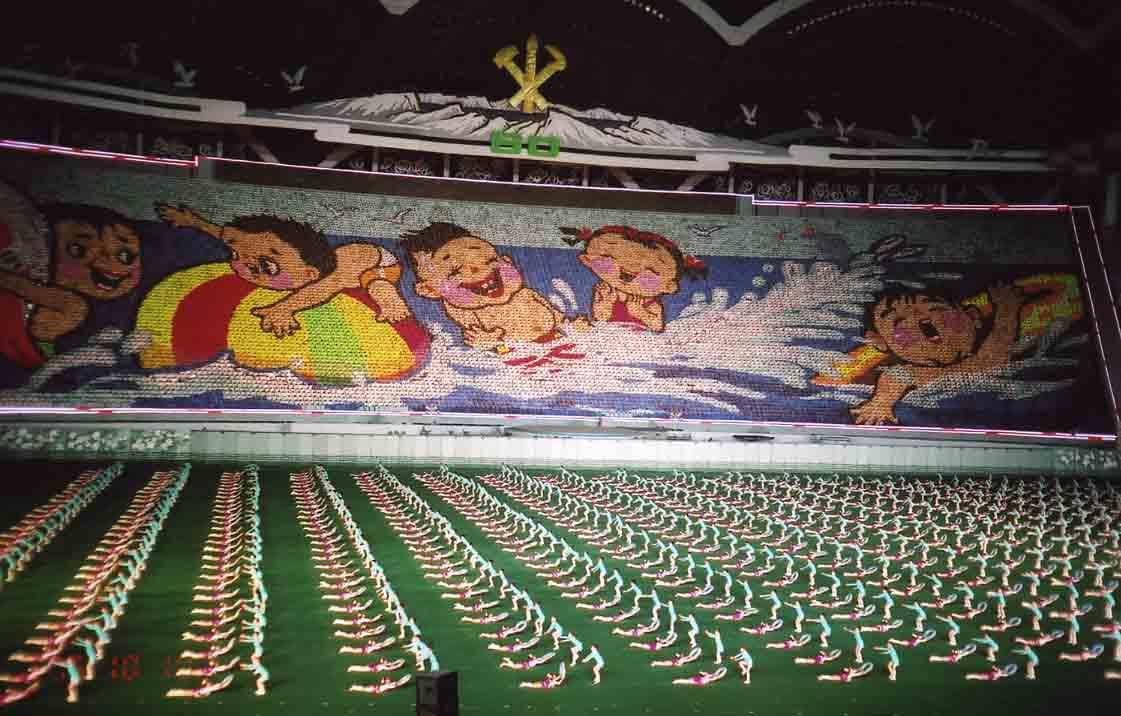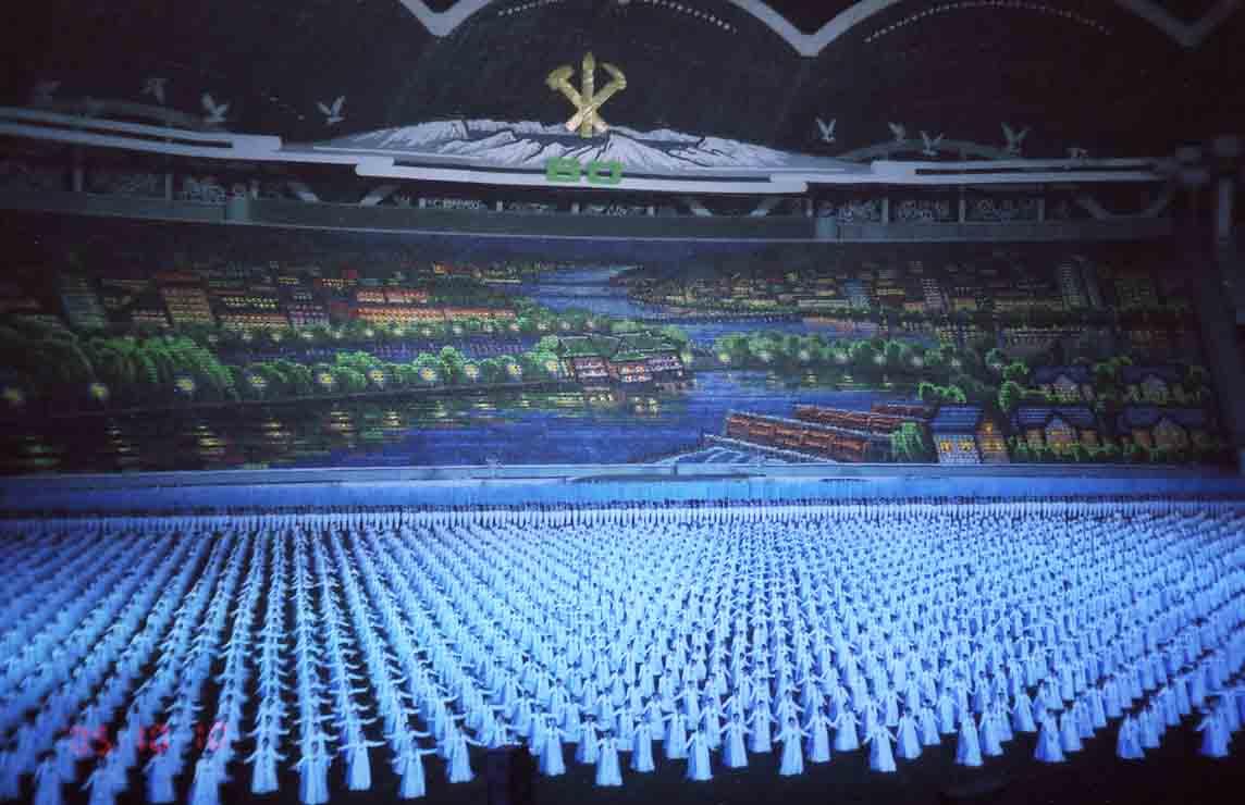今回のアリラン祭(マスゲーム)は、祖国光複60周年記念日の8/15から朝鮮労働党創設60周年記念日の10/10(二週間程度延長されたそうだが)まで日曜を除いて毎日行われている。参加人数は何と10万人、約1時間半に渡って行われるスケールのデカイ一大イベントである。15万人収容といわれているメーデースタジアムは、メインスタンド側が客席で、その反対側は人文字を作る学生達で埋め尽くされている。20時開始予定だがその前にウォーミングアップとばかりに掛け声を挙げながら文字を次々と描き出しているがこれが凄まじい。期待が一層高まった。