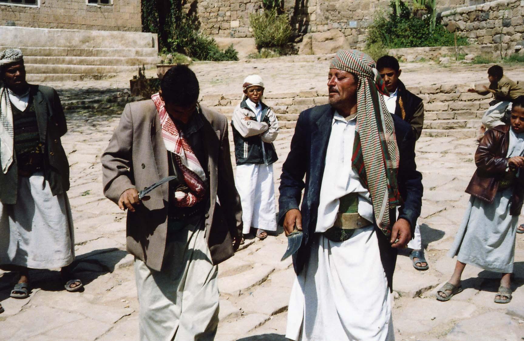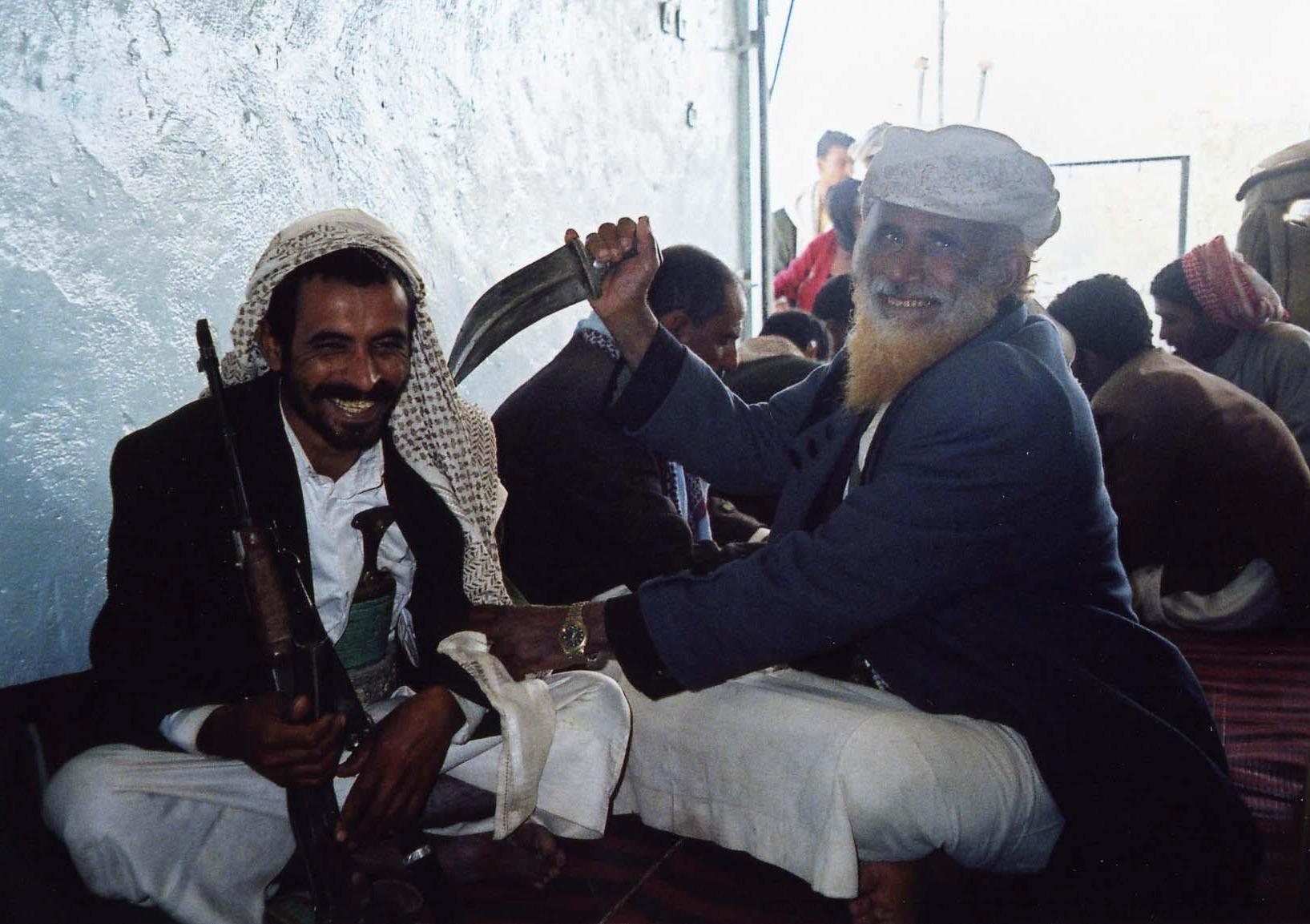 イエメンの男達は、オバQを彷彿とさせるアラブ服を着込み、頭にターバンを巻き、サンダルを履いて、ジャンビーアという短剣を腹の前に差し、何故かジャケットを羽織っているというのが基本的なファッションである。日本で言うなら、着物を着て、チョンマゲを結って、草履を履いて、日本刀を差し、何故かジャケットを羽織っているといったところでしょうか。このジャンビーア、街中の至るところで売られており、記念と思い、一本購入した。現地人に見せたところ、小さくて子供用だなと笑われてしまったが。帰りは、機内には持ち込めないので、郵送した。紛失したら仕方ないと思っていたが、無事に到着。で、これをどうするか?まあ、押入れ行きでしょうね。。