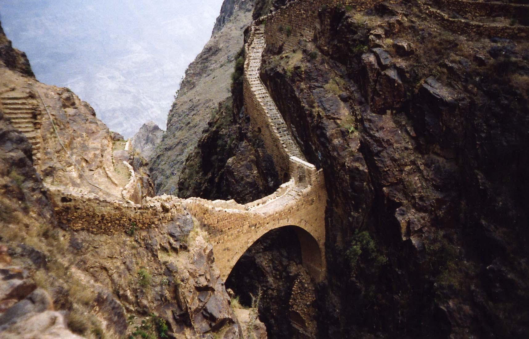 首都サナア以外にも色々と見所があり、世界遺産に登録されているシバームや、標高3000mを超える街シャハラにも足を伸ばした。シバームは砂漠の摩天楼と呼ばれており、砂漠の中に突如現れる高層ビル群である。ビル群の中もブラブラ歩いてみたが、かなり老朽化が進んでおり、早い話がボロボロでありました。とはいえ、少し離れた丘の上から眺めるシバームは幻想的で実に美しい。シバームは離れて見るものです。そして、イエメンのお札のデザインにもなっている有名な石橋があるシャハラ。デコボコの山道をトラックの荷台で揺られまくりながら行きました。強大なオスマン・トルコに抵抗し独立を保った勇敢は部族の村らしいが、こんな不便な場所はオスマン・トルコも要らなかったんじゃないのか。